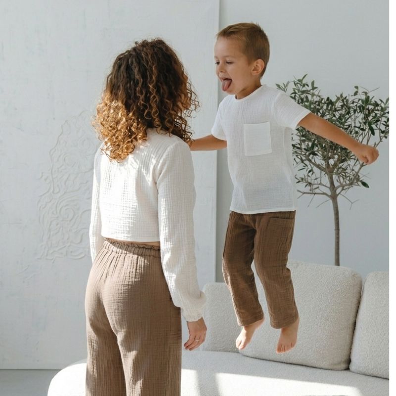 Muślinowe zestawy dla mamy i syna! Szukałaś? To już znalazłaś! Postaw na wspólny kolor i wybierz dogodne ubranie dla siebie i syna. Wspólny kolor i unikatowy splot muślinu to przepis na idealny, dopasowany do Was zestaw dla mamy i syna.